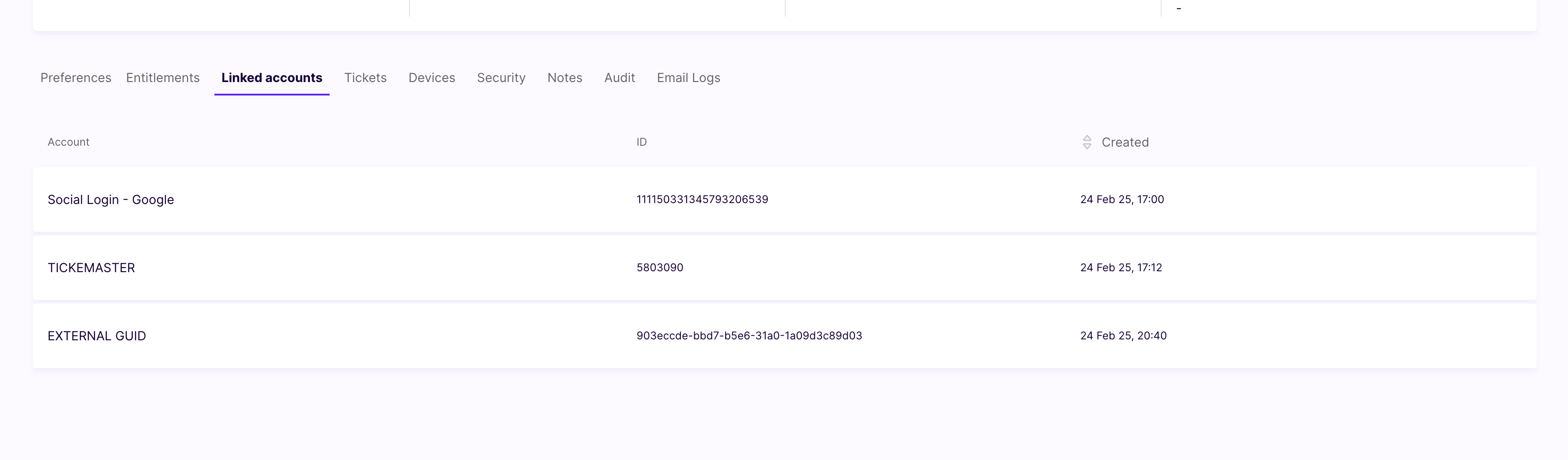 Account Links service allows to store references to external systems, such as Social Logins (Google, Facebook, Apple) or client-specified external IDs (mappings with Ticketmaster, Seatgeek and other systems).