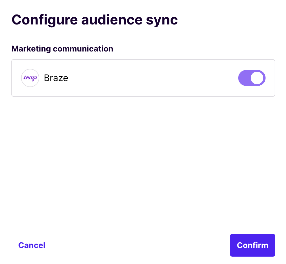 To enable the Braze synchronisation for a given audience, it is necessary to open up that audience, click on the settings icon in the Audience sync panel, select Braze from the list of supported integrations and click on the Confirm button, as shown in the following picture. If Braze is not listed among the supported integrations, get in touch with our development team.