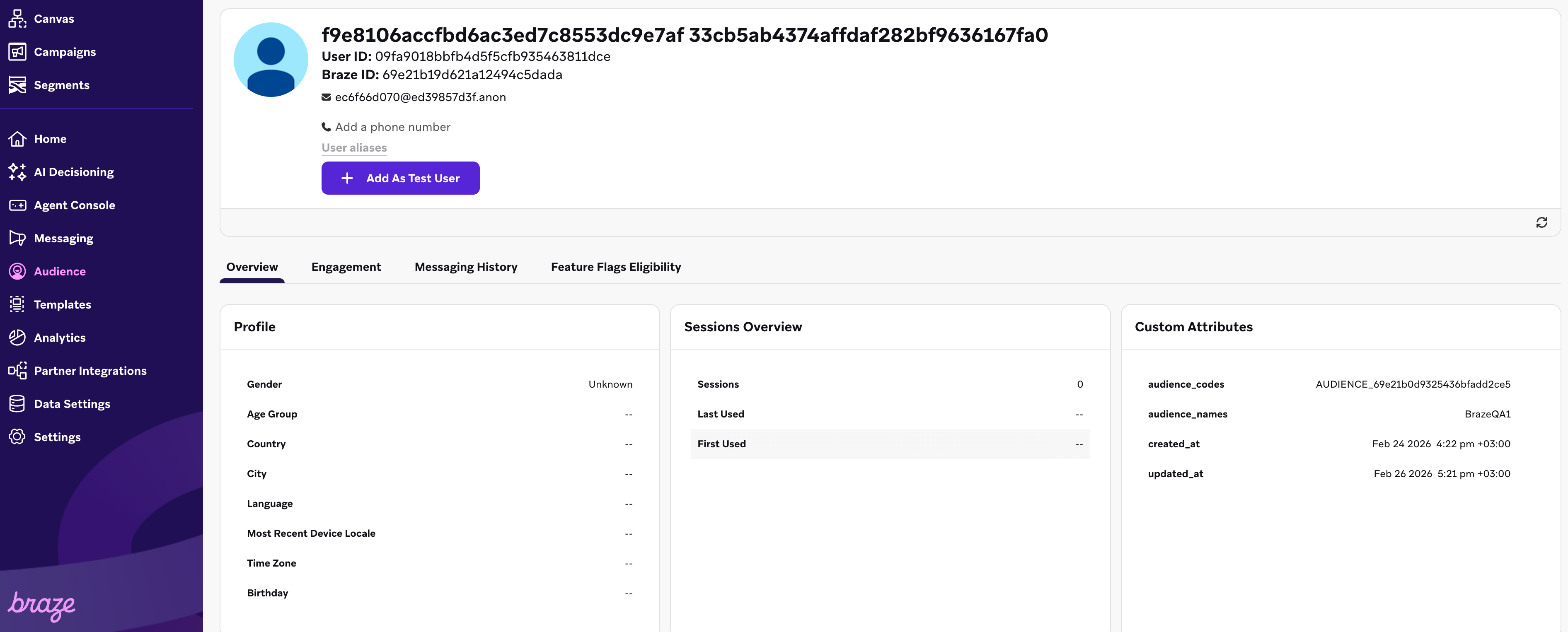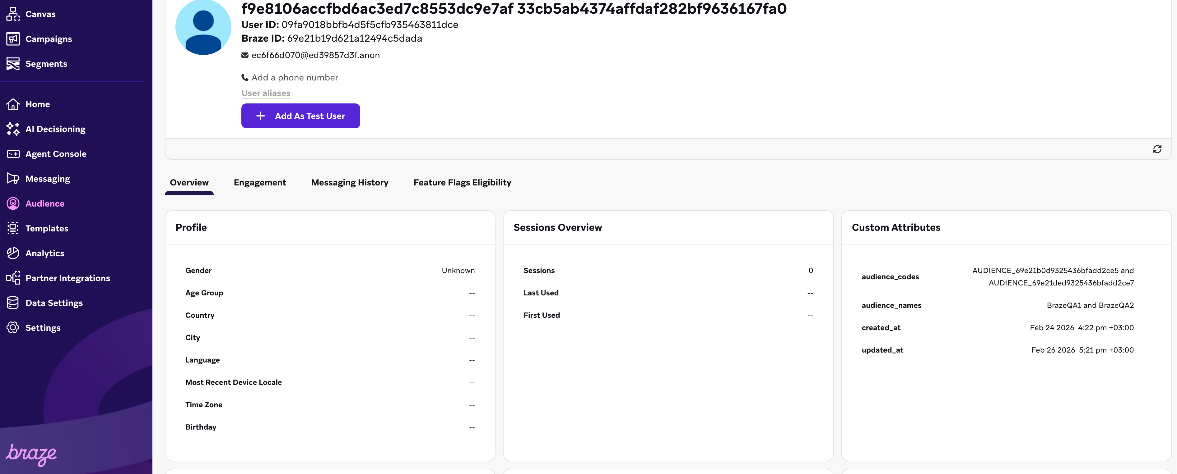 Considering the audience in the picture above, the audience name is BrazeQA1, the audience code is AUDIENCE_69e21b0d9325436bfadd2ce5. When synchronising for the first time the audience BrazeQA1 with Braze, 17 user profiles will be created in Braze, with the data fields discussed above. BrazeQA1 will be appended to the audience_names array of each target user profile, and AUDIENCE_69e21b0d9325436bfadd2ce5 will be appended to the audience_codes array of each target user profile, as displayed in the following picture: