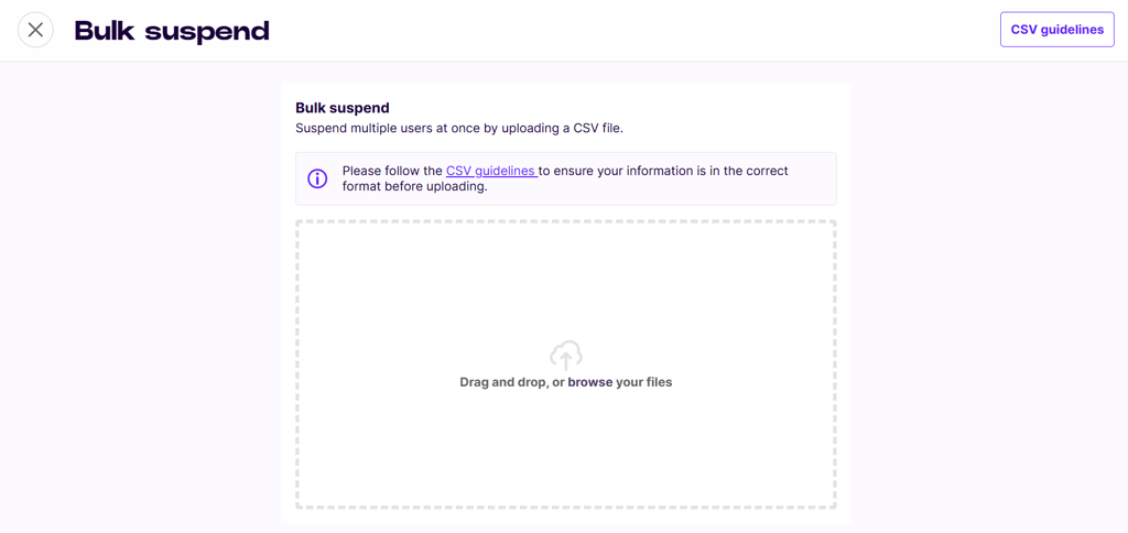 Step 2: Upload to Cortex On the Bulk Suspend screen, you can drag and drop your file or browse your computer to upload it.