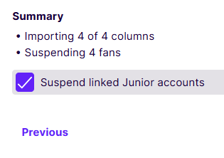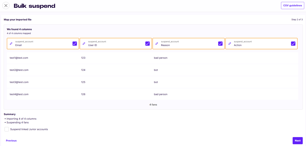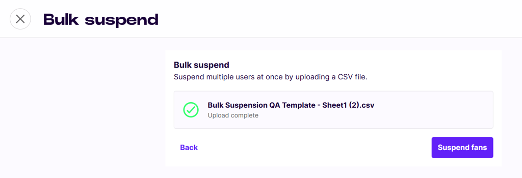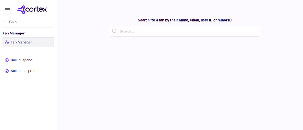 The Bulk Suspend/Unsuspend feature empowers Cortex users to efficiently manage large groups of fans, specifically aiding in the rapid banning of ticket touts and bad actors. Instead of managing accounts individually, this service allows you to input a list of identified fan IDs to be processed all at once.