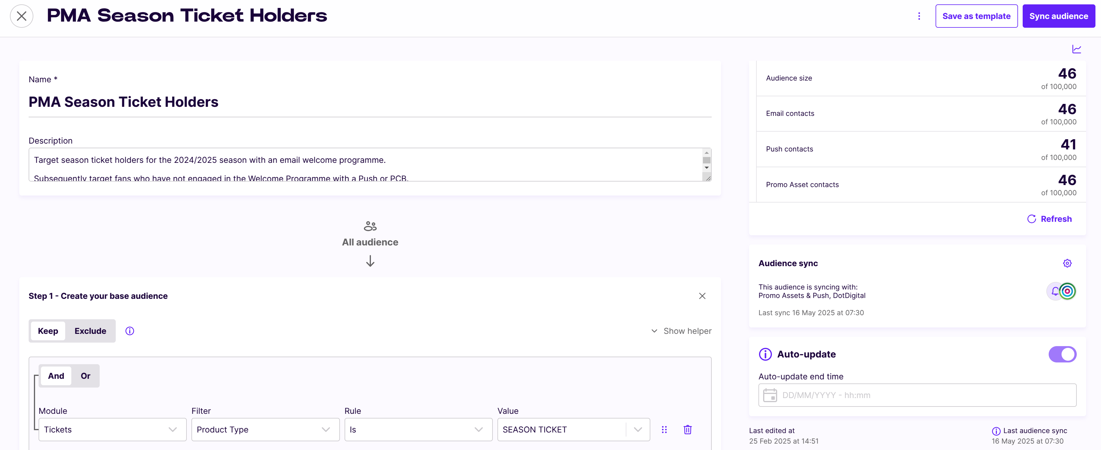 If you want your audience to be automatically synchronized on a regular basis, make sure you enable the Dotdigital integration for that audience (as explained above) and you check the Auto-update option.